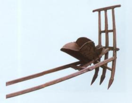 这样能一天播种上千公顷的耧车是什么样子呢,一起来看看古人的智慧吧。耧车是由耧把和耧把以下的三条耧腿构成,三条耧腿是弧形的,并且上面宽下面窄,等距离的穿在耧把当中,还有三条横木在耧把的下方把耧腿固定住,让耧车更加牢固。除了耧把和耧腿还有漏种管,漏种管是“人”字形式,在耧腿之中,有个大的方木盒子是耧斗,主要是为了盛放播种的种子,后面还有耧种管,是和耧斗相接的,通过耧斗底部板子上的一个活动挡板进行控制种子播种的疏密。